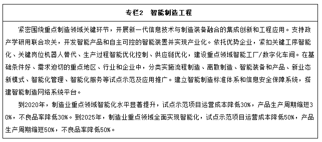 到2020年,基本實(shí)現工業(yè)化,制造業(yè)大國地位進(jìn)一步鞏固,制造業(yè)信息化水平大幅提升。掌握一批重點(diǎn)領(lǐng)域關(guān)鍵核心技術(shù),優(yōu)勢領(lǐng)域競爭力進(jìn)一步增強,產(chǎn)品質(zhì)量有較大提高。制造業(yè)數字化、網(wǎng)絡(luò )化、智能化取得明顯進(jìn)展。重點(diǎn)行業(yè)單位工業(yè)增加值能耗、物耗及污染物排放明顯下降。