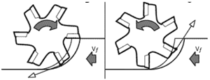 在高切削加工中,應盡量選用順銑加工,因為在順銑時(shí),刀具剛切入工件產(chǎn)生的切屑厚度為最大,隨后逐漸減小。在逆銑時(shí),刀具剛切入工件產(chǎn)生的切屑厚度為最小,隨后逐漸增厚,這樣增加了刀具與工件的摩擦,在刀刃上產(chǎn)生大量熱,所以在逆銑中產(chǎn)生的熱量比在順銑時(shí)多很多,徑向力也大大增加,緩解了高硬度切削時(shí)切削熱對刀具的損傷。同時(shí)在逆銑中刀刃受力狀態(tài)較順銑更為惡劣,降低了刀片的使用壽命,順銑和逆銑時(shí)刀具切入工件的過(guò)程,如圖(二)所示。
