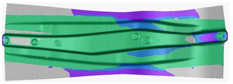 摘要:本文結合高強度鋼艙邊梁后段的成形工藝難點(diǎn)和回彈較大的特點(diǎn),利用CAE分析技術(shù)對其進(jìn)行全工序分析和回彈分析,對其成形缺陷和回彈趨勢進(jìn)行了有效的預測。同時(shí)對回彈產(chǎn)生的原因進(jìn)行分析,制定合理的回彈補償方案,并運用CAE反向回彈補償技術(shù)對模具型面進(jìn)行補償,補償后CAE驗證回彈均在要求的+-0.5mm之內;將回彈補償后的模具型面進(jìn)行加工,經(jīng)該模具生產(chǎn)的樣件的尺寸精度滿(mǎn)足要求且樣件的合格率達92.46%,為高強度鋼梁類(lèi)零件的CAE回彈補償提供了一定的參考。