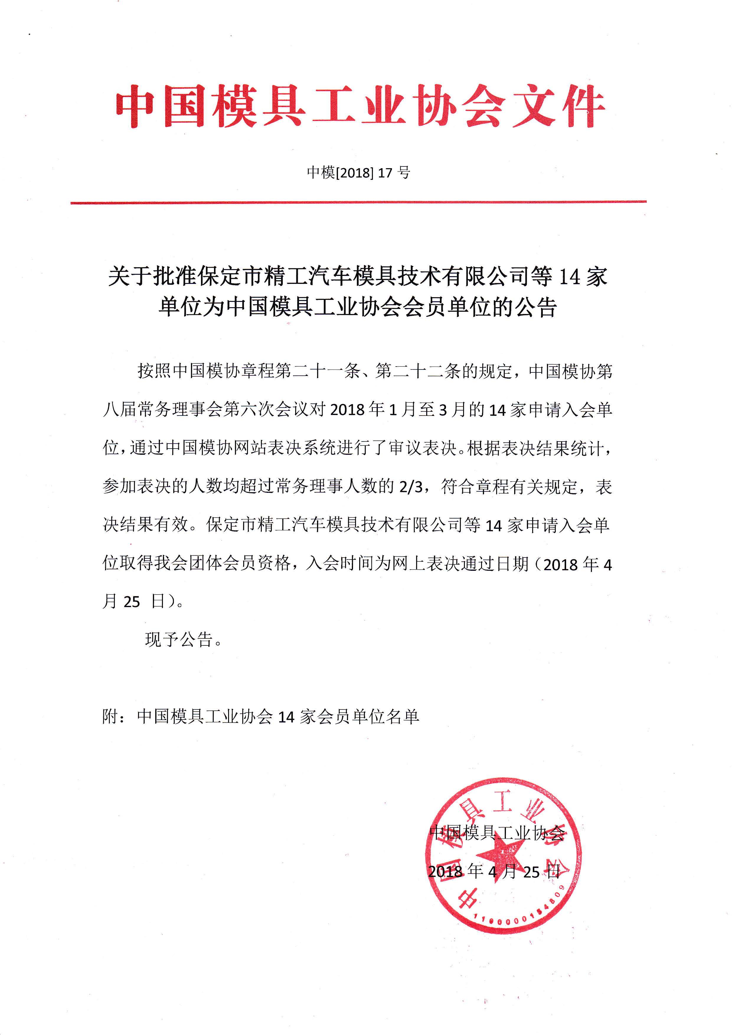 關(guān)于批準保定市精工汽車(chē)模具技術(shù)有限公司等14家單位為中國模具工業(yè)協(xié)會(huì )會(huì )員單位的公告