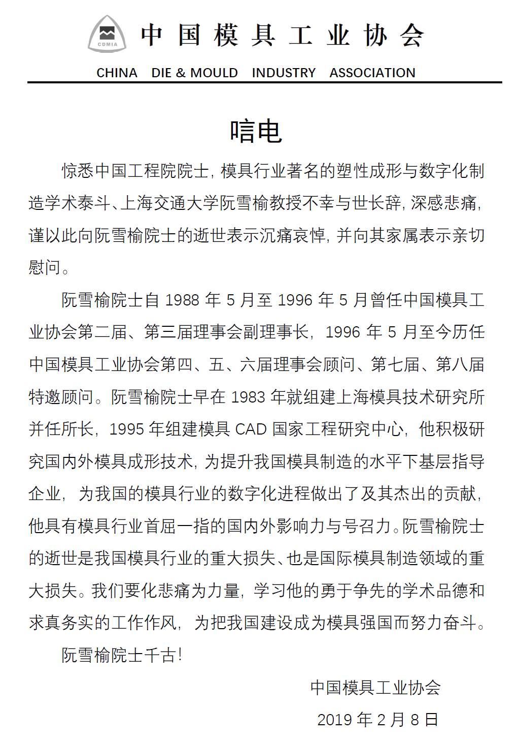 2月11日在滬阮院士告別儀式,李建軍副會(huì )長(cháng)和趙震副會(huì )長(cháng)都代表中國模協(xié)致意阮院士家屬,寄托我們中國模具行業(yè)的哀思。中國模協(xié)送了花圈也發(fā)了唁電。