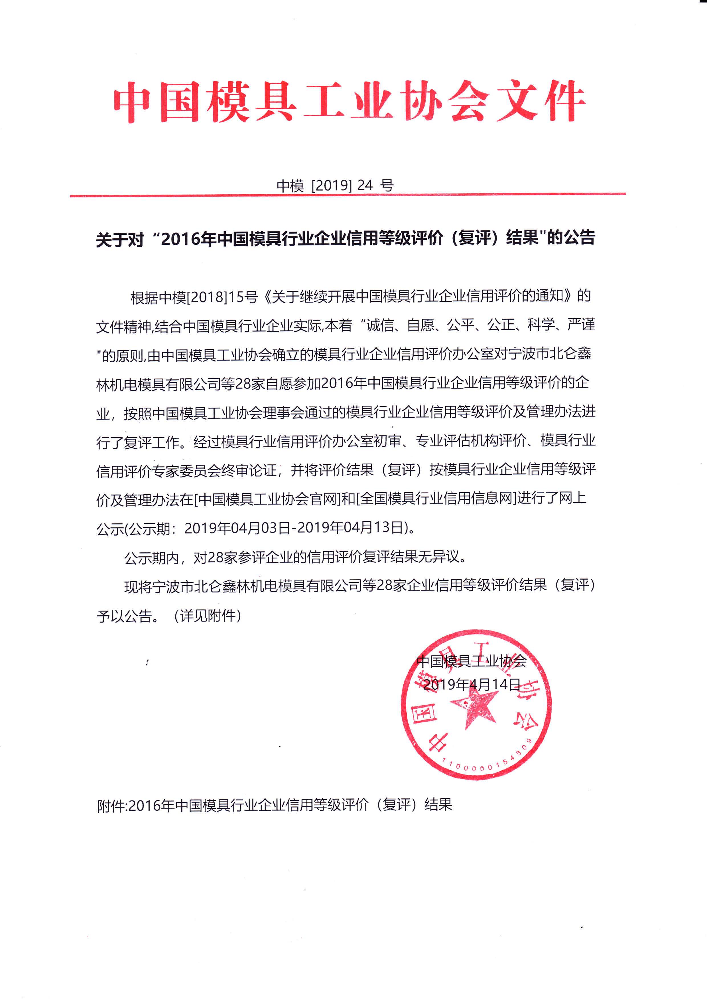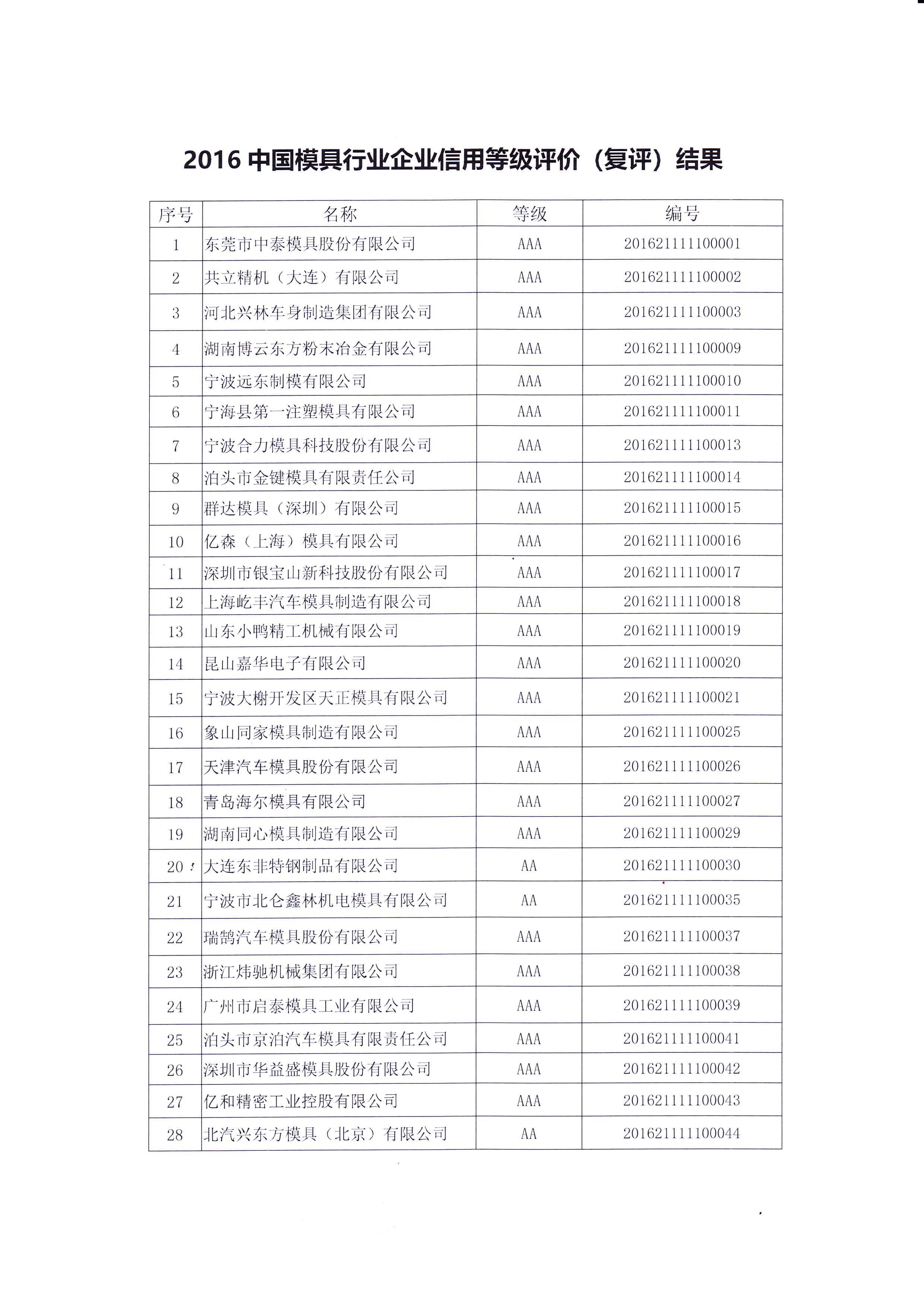 關(guān)于對“2016年中國模具行業(yè)企業(yè)信用等級評價(jià)(復評)結果”的公告