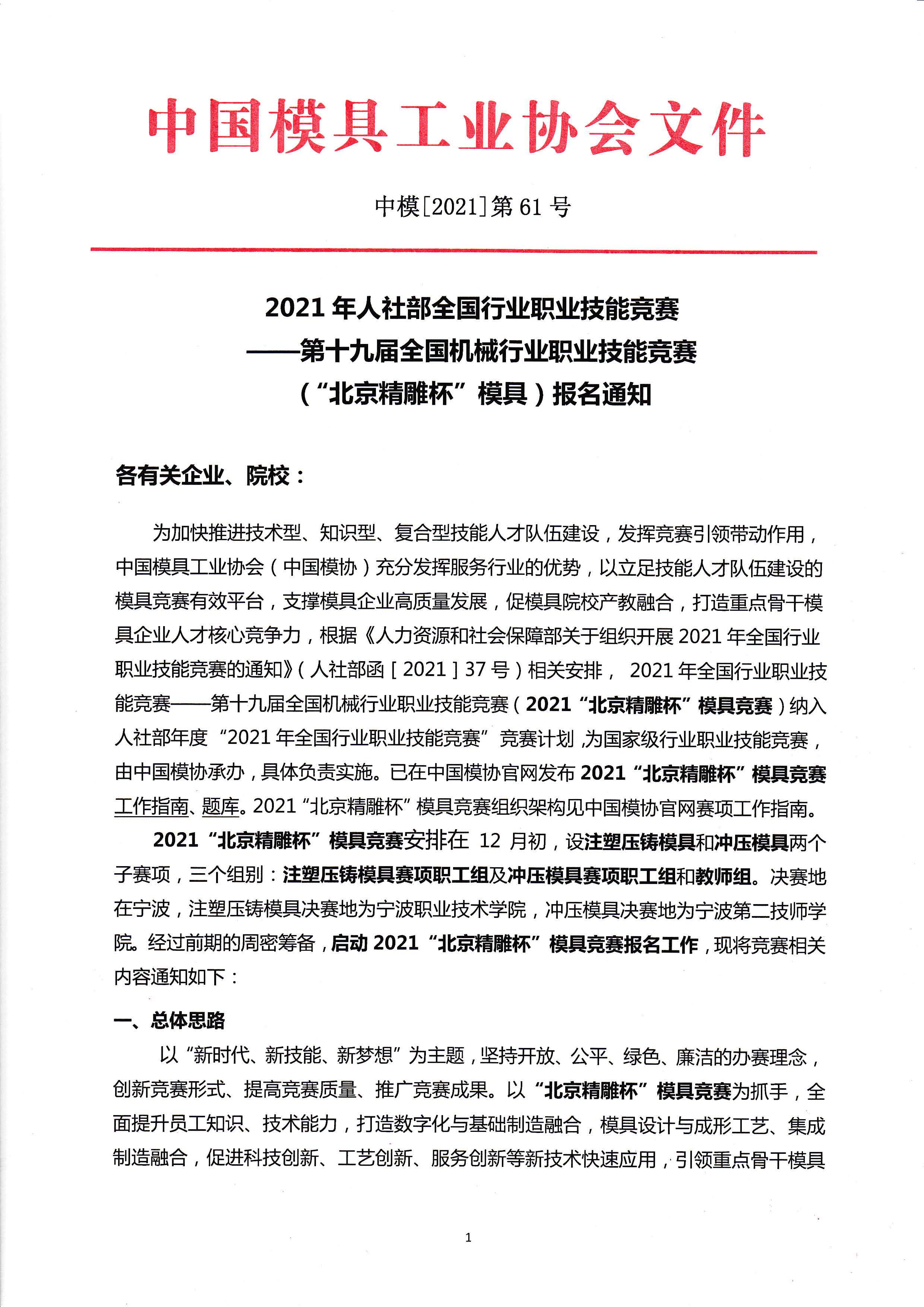 2021年人社部全國行業(yè)職業(yè)技能競賽——第十九屆全國機械行業(yè)職業(yè)技能競賽(“北京精雕杯”模具)報名通知
