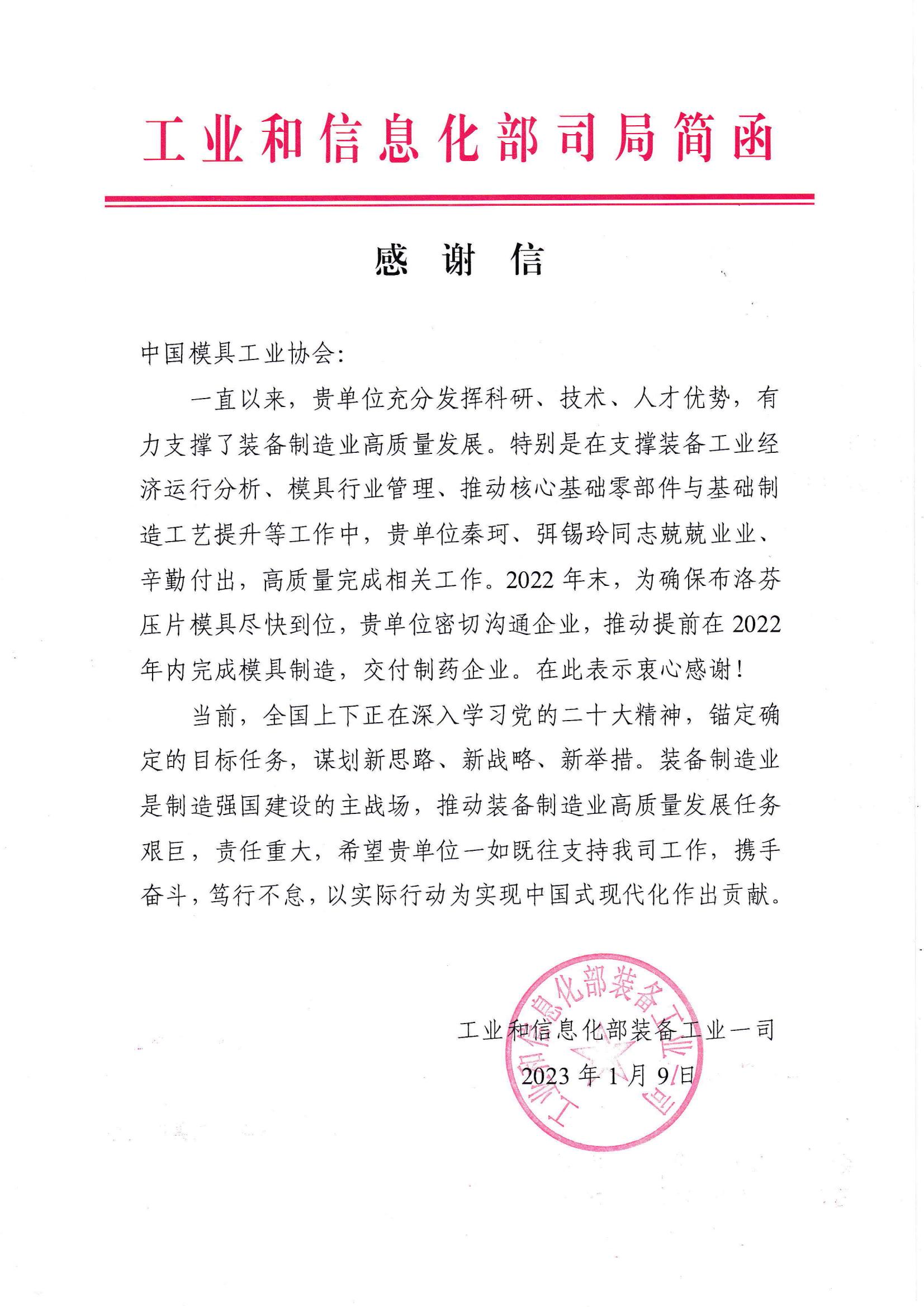 工信部裝備工業(yè)一司致中國模協(xié)感謝信