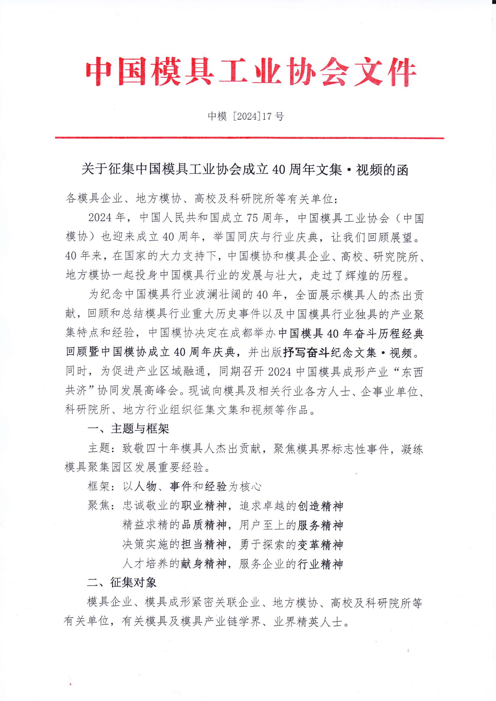 關(guān)于征集中國模具工業(yè)協(xié)會(huì )成立40周年文集 視頻的函