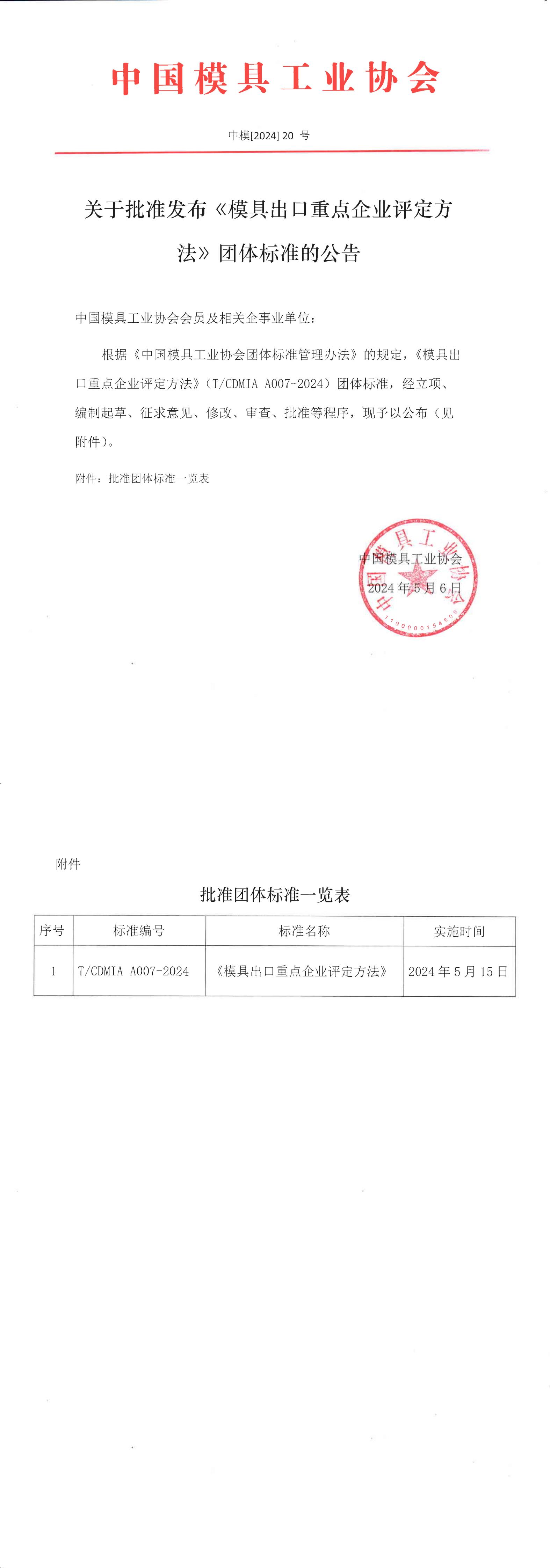 關(guān)于批準發(fā)布《模具出口重點(diǎn)企業(yè)評定方法》團體標準的公告